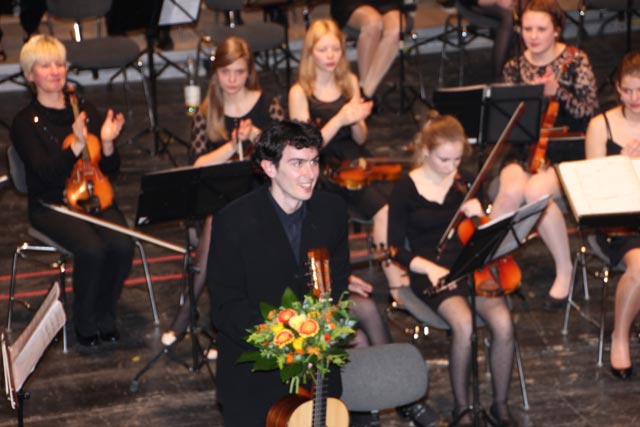 Im ersten Teil erklangen Originalkompositionen, wie der 4. Satz aus der 2. Sinfonie „Hakon Jarl“ von Carl Reinecke und das berühmte Gitarrenkonzert „Concerto de Aranjuez“ von Josquin Rodrigo mit dem begabten Solisten Pedro Izquierdo Canovas.