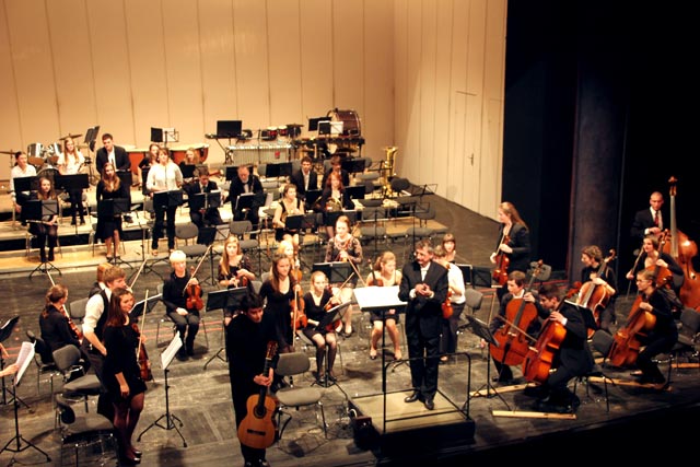 Und auch diesmal kamen die vielen Konzertbesucher wieder voll auf ihre Kosten, als das größte Ensemble des Kreismusikschulees mit jugendlichem Schwung und großer Spielfreude unter Leitung von Johannes Groh ein anspruchsvolles und sehr abwechslungsreiches Programm zu Gehör brachte.