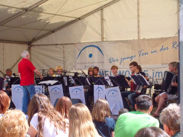 In der Zeit von 10.00 Uhr bis ca. 16.00 Uhr verbreiteten auf kleiner und großer Bühne und an mehreren Ständen verschiedene Ensembles wie die Gitarrinis, Blasorchester, Amici Allegri, Akkordeonorchester, Gesangsensembles, 4 Musikschulbands, aber auch Pianisten, Bläser, Sänger und natürlich die jüngsten Schüler der Musikalischen Früherziehung künstlerisches Flair.