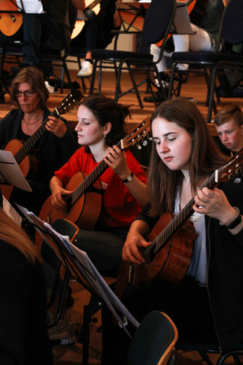 Auch Anna Zeisler, Lysann Hammer, Lara Kühnel, Cecile Zimmermann und Gitarrenlehrerin Ute Kerkau von der Kreismusikschule Kon.centus reisten in die Müritzstadt, um gemeinsam mit anderen jungen Musikern im großen Gitarrenorchester MV unter Leitung von Organisator Fridolin Zeisler zu proben und zu musizieren.