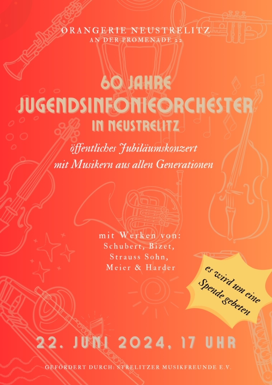 Vor der neu eröffneten Orangerie in Neustrelitz fand am 22. Juni 2024 das generationsübergreifende Jubiläumskonzert "60 Jahre Jugendsinfonieorchester" statt. Viele ehemalige waren bereits am Freitag zuvor gekommen und wohnten der freitäglichen JSO-Probe bei. Sommerliches Wetter, eine fantastische Kulisse und die ausgelassene Stimmung verhalfen zum großen Erfolg dieser besonderen Veranstaltung.