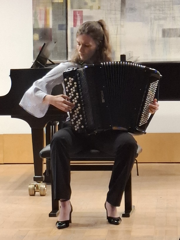 Dabei durfte sich das Publikum auf ein abwechslungsreiches und interessantes Programm mit Violine, Viola, Violoncello, Klavier, Gitarre, Akkordeon und Gesang freuen, in dem sich besonders auch die jüngeren LehrerInnen der Kreismusikschule künstlerisch mit Werken u.a. von J.S. Bach, W.A. Mozart, J. Rodrigo oder E. Elgar präsentierten. Das Publikum bedachte alle musikalischen Beiträge mit ausgiebigem Beifall, wohl der schönste Dank für jeden Künstler. Gleichzeitig wurde mit dem Konzert eine sehr schöne Ausstellung „Vom SEHENHÖREN“ mit „musikalischen“ Bildern von Helga Suckow, die selbst anwesend war, im oberen Foyer der Musikschule eröffnet. Ein besonderer Dank wieder an den Förderverein für sein Engagement und die kulinarische Bereicherung in der Konzertpause.