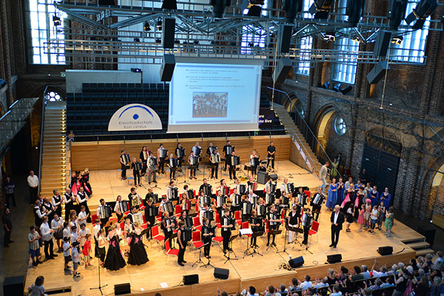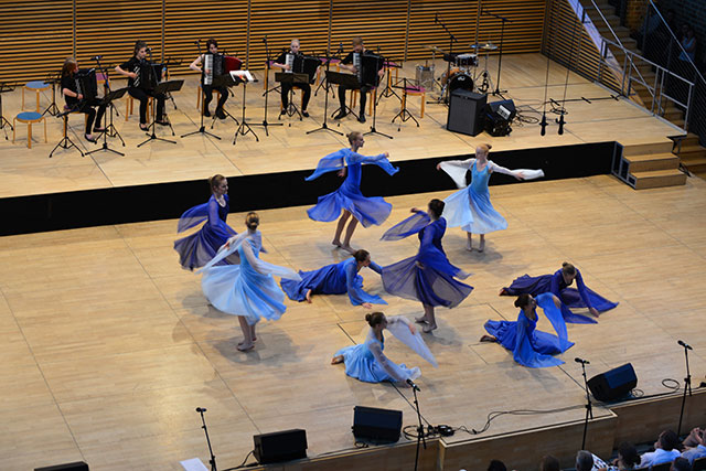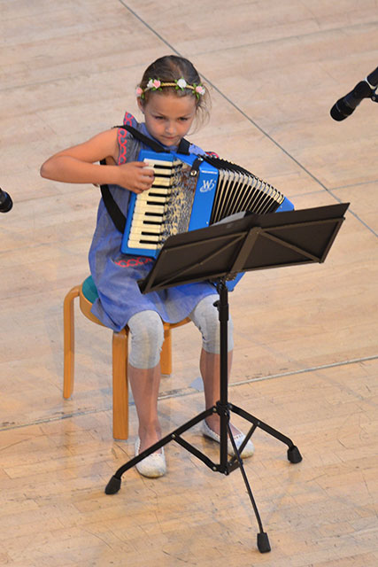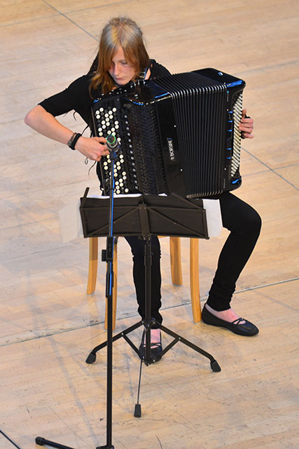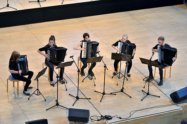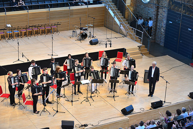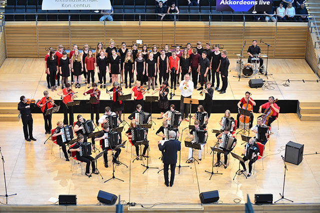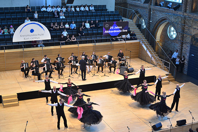 Aber auch die Akteure vor Ort ließen es sich nicht nehmen, bei „25 Jahre Akkrodeons live“ mitzuwirken: der Chor des Musischen Hauses G.-E.-Lessing und das Ensemble Amici Allegri beim Auftakt bei „Conquest of paradise“, der Tanzkreis Neubrandenburg beim Walzer No. 2 von Schostakowitsch oder die Tanzaktion Neubrandenburg bei Bachs Air. Vom ersten großen Auftritt der kleinen Tessa solo auf ihrem Akkordeon über viele Preisträger von Landes- und Bundeswettbewerben über Ensembles und Orchester bis zum großen Finale mit ehemaligen Schülern, als mehr als 60 Spieler auf der Bühne musizierten, zeigten alle, was in ihnen und in ihren Instrumenten steckt.