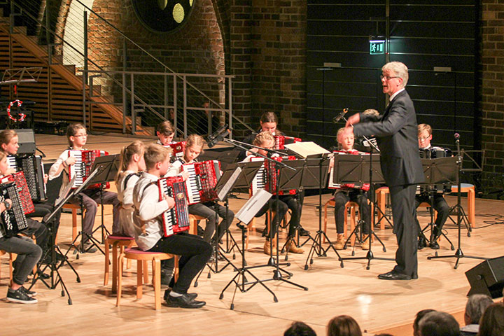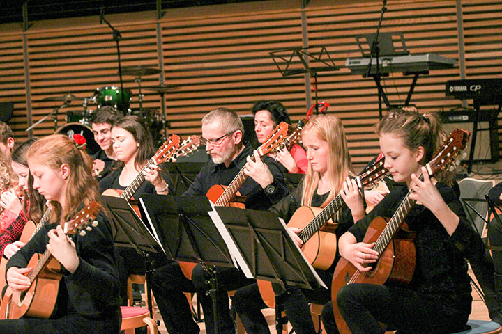Das facettenreiche und sehr abwechslungsreiche Programm trug wieder dem besonderen Anliegen des gemeinschaftlichen Musizierens- quer durch alle Altersgruppen- eindrucksvoll Rechnung. Von den jüngsten Eleven der Musikalischen Früherziehung bis zum Erwachsenenensemble der Amici Allegri, über das große Gitarrenensemble, das Blasorchester, kleines und großes Akkordeon- orchester, Kinderchor und Streichergruppe, Lehrerband, Klavier 6-händig, Gitarrentrio, Querflöten- und Blechbläserquartett bis hin zu wundervollen solistischen Darbietungen mit verschiedenen Blasinstrumenten, Klavier und Gesang reichte das musikalische Spektrum. Neben besinnlicher Adventsmusik, die weihnachtliches Flair verbreitete, waren auch schwungvoll optimistische Werke- alle mit großem künstlerischem Können vorgetragen- zu hören.