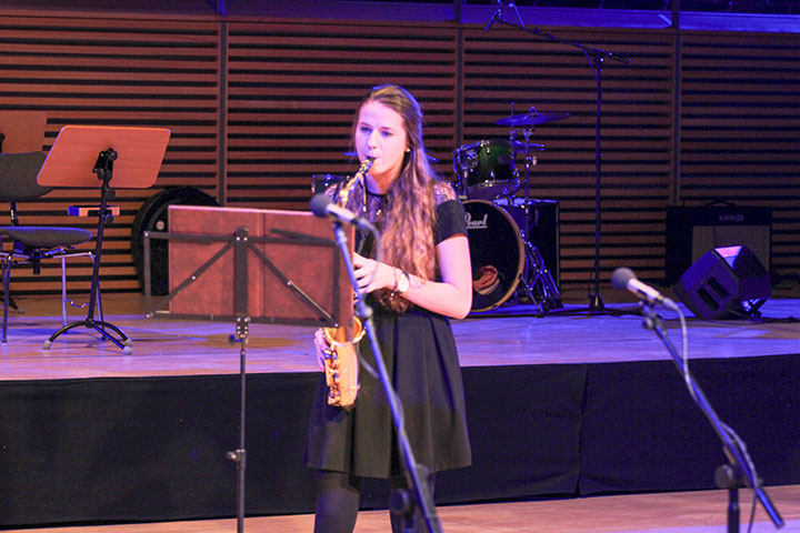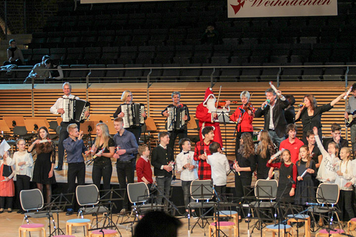 Zum Abschluss erklang das bekannte Weihnachtslied „Felice Navidad“, gemeinsam musiziert und gesungen von Band, Musikschullehrern und –schülern und dem Publikum im Saal, das zum Finale noch einmal einen begeisternden Schlusspunkt hinter ein beeindruckendes Konzert setzte. Riesiger Beifall mit Zugabe war der schönste Lohn für alle Beteiligten.
